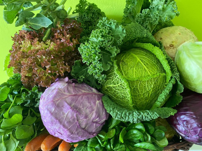 Hier haben wir eine breite Palette von roten und grünen Blattsalaten, sowie Kopfsalat und im Herbst Endivien.